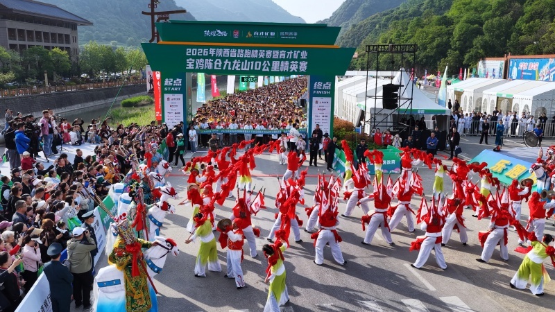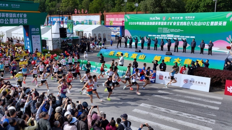 4月26日9时,2026年陕西省路跑精英赛暨育才矿业宝鸡陈仓九龙山10公里精英赛在九龙山景区鸣枪开跑。5000名跑者如黄色浪潮般涌入丹霞赛道,在苍翠山峦间绘就“人在画中跑”的春日盛景。