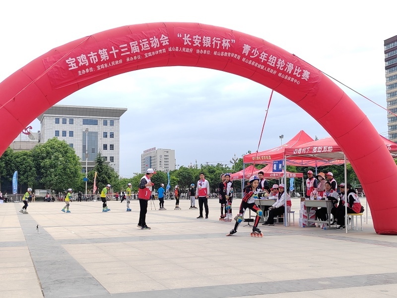 4月27日,宝鸡市第十三届运动会“长安银行”青少年轮滑比赛在岐县蔡家坡文体广场举行。来自金台区、凤翔区、岐山县等7支队伍116名青少年选手参赛。