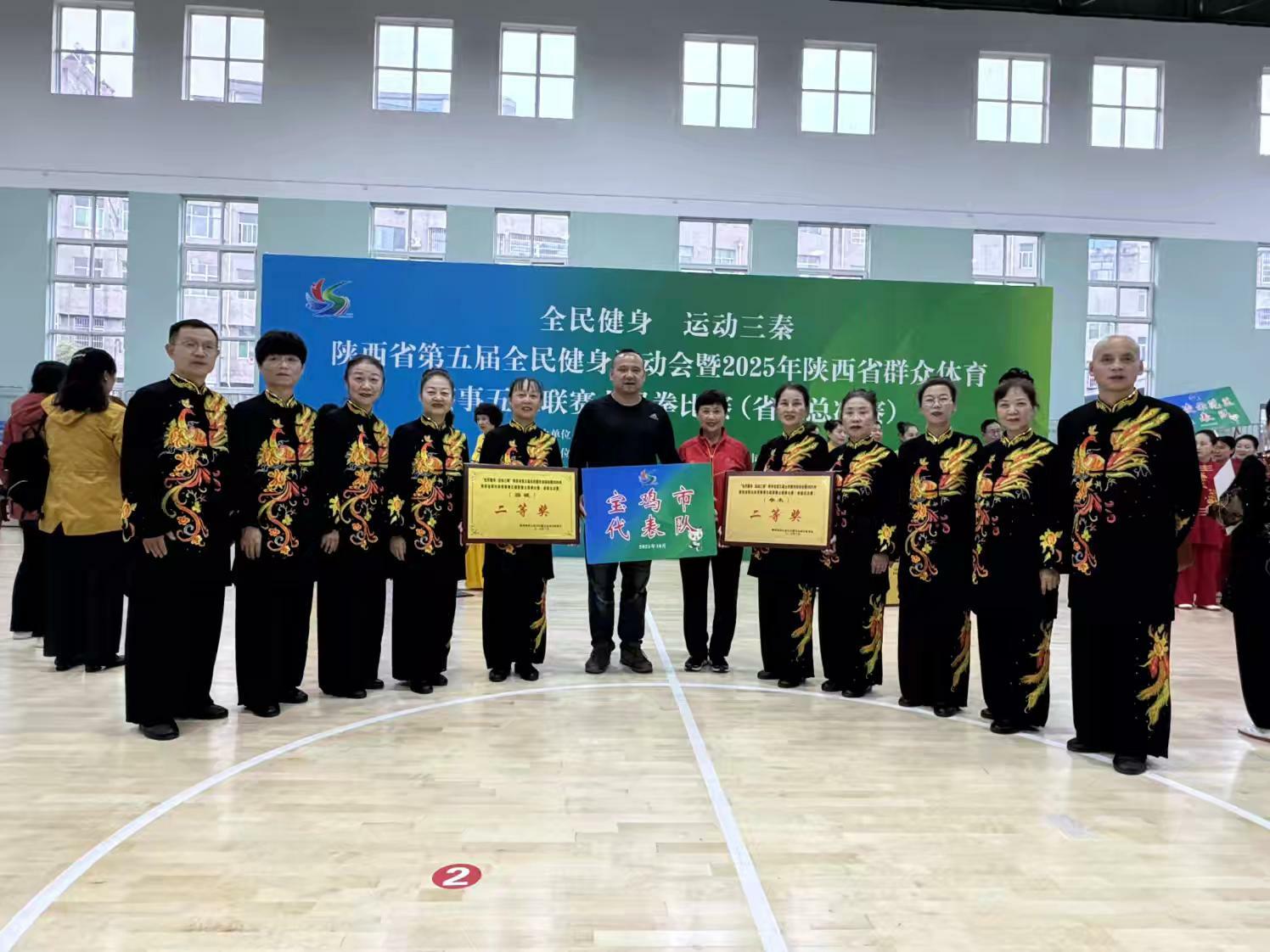 10 月 10 日下午,陕西省第五届全民健身运动会暨 2025 年群众体育五级联赛太极拳(省级总决赛)在商洛市商南县体育馆圆满落幕。宝鸡市太极拳代表队在此次决赛中获得太极拳和太极剑两个集体项目二等奖。